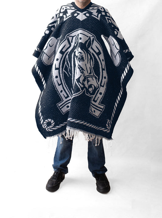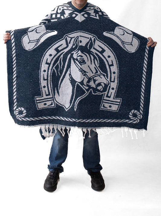 Men's Mexican Poncho - Two Horses - BLUE