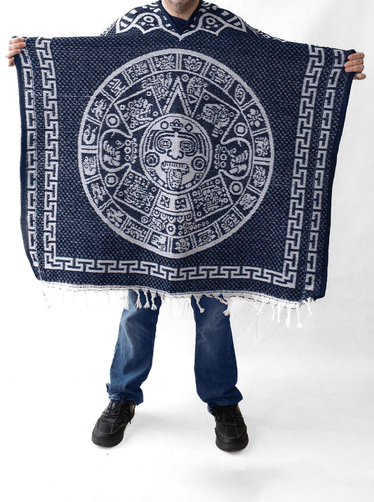 Mexican Poncho for Men - Aztek Calendar - BLUE