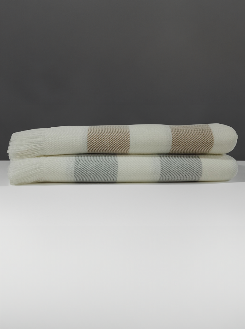 Gestreifte Alpaka-Überwurfdecke mit Fransen | Weiß und Beige