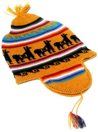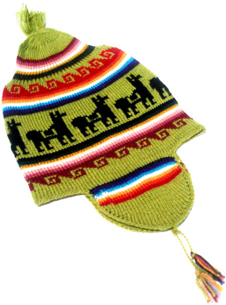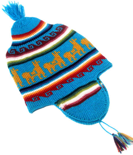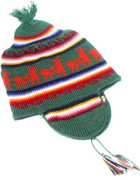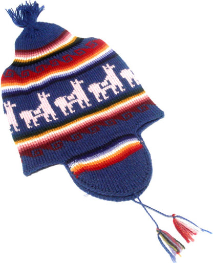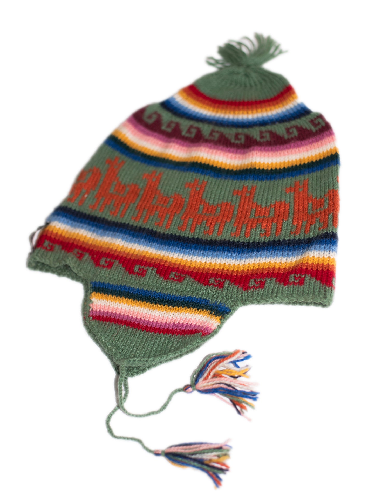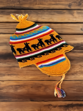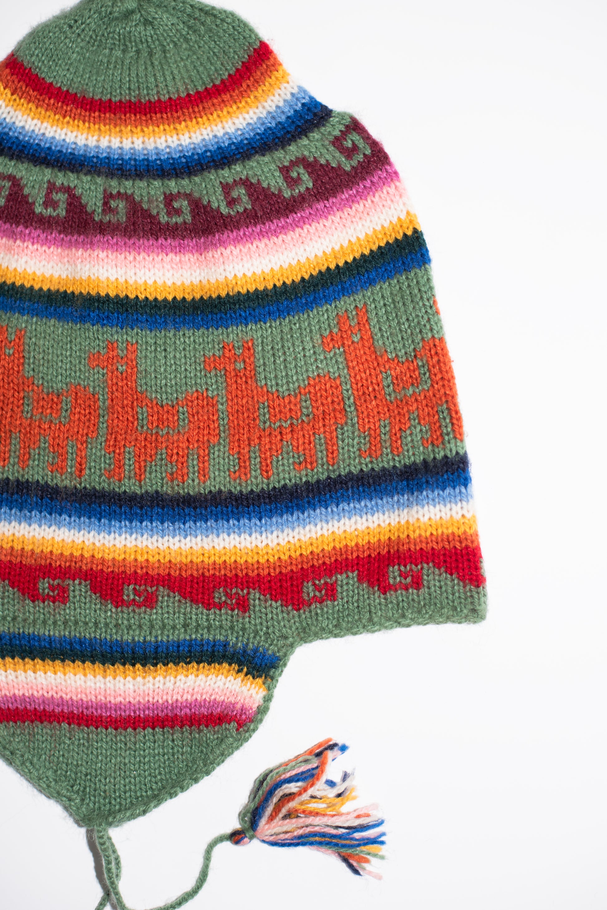EiSchönes Lluchu, handgefertigt von bolivianischen Kunsthandwerkern. Es zeigt ein feines Design mit verschiedenen bunten Streifen und Lamafiguren ringsum. Dieses Accessoire ist vielseitig, lässig und perfekt für jede Outdoor-Aktivität in der kalten Winterzeit.