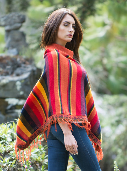 Nota: Al ser este producto artesanal, puede presentar ligeras variaciones respecto a las fotografías. Descripción: Poncho Rayado Multicolor con líneas diagonales y cuello alto.