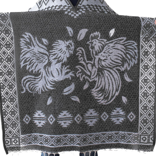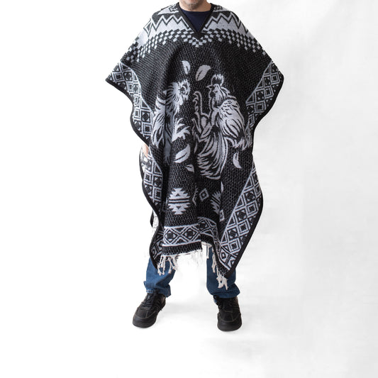 Poncho Mexicano de Alpaca para Hombre – Gallos Enfrentados – NEGRO