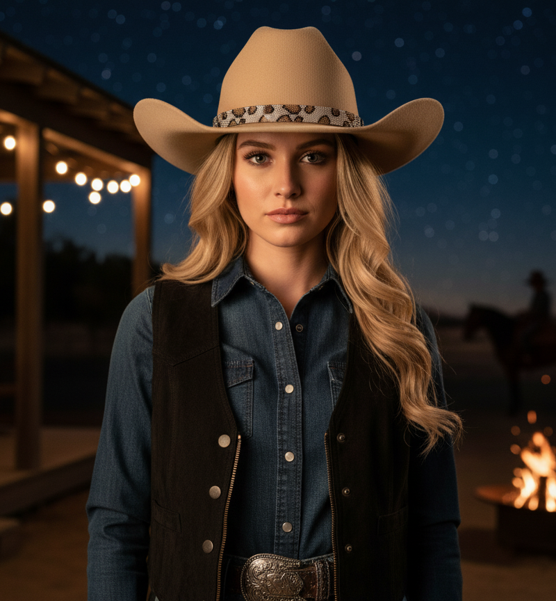 Crafted with a smooth, flexible band in a trendy leopard print, its eye-catching sparkle turns any Western or Panama hat into a statement piece. Whether you're channeling cowgirl chic or adding flair to your boho look, this hat band is your go-to upgrade for elevated Western fashion.