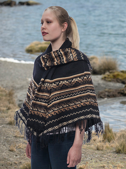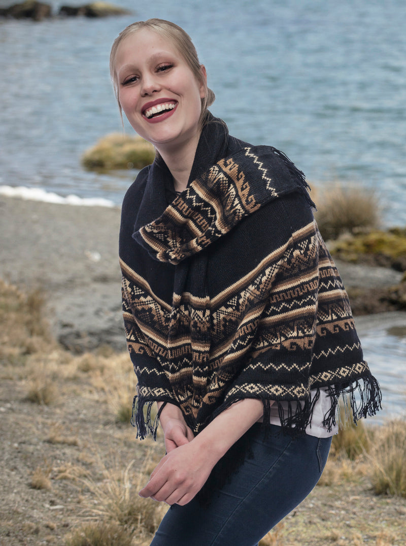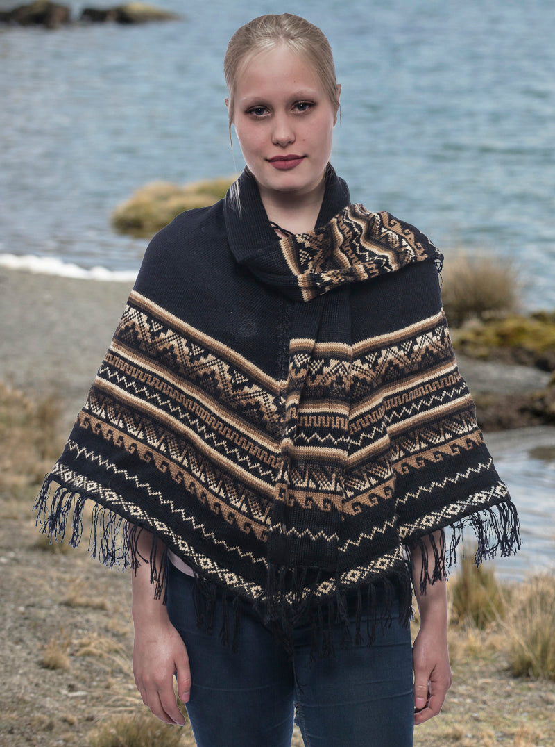 Black Alpaca Poncho with Scarf for Women