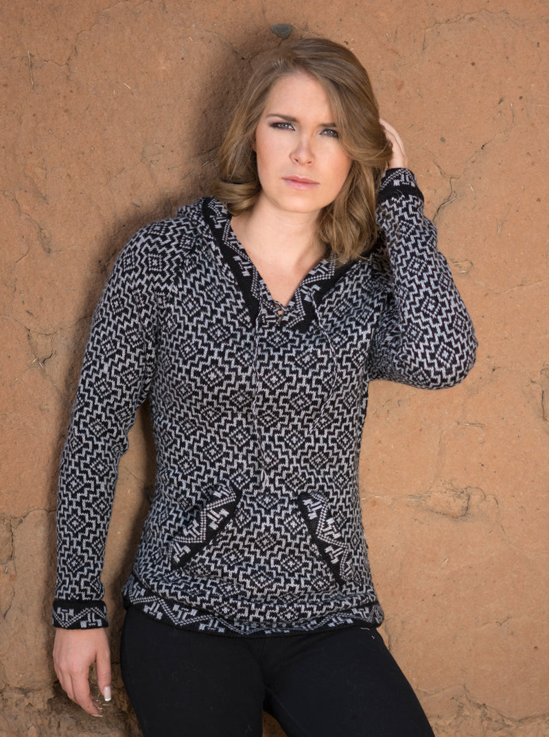Pull fait à la main par des artisans boliviens, c'est un modèle avec capuche, des poches sur le devant et des franges sur le bas. Il a un style décontracté et moderne, avec des designs géométriques sur les bords. Ce vêtement est versatile et chaud, parfait pour las saisons froides de l'année.