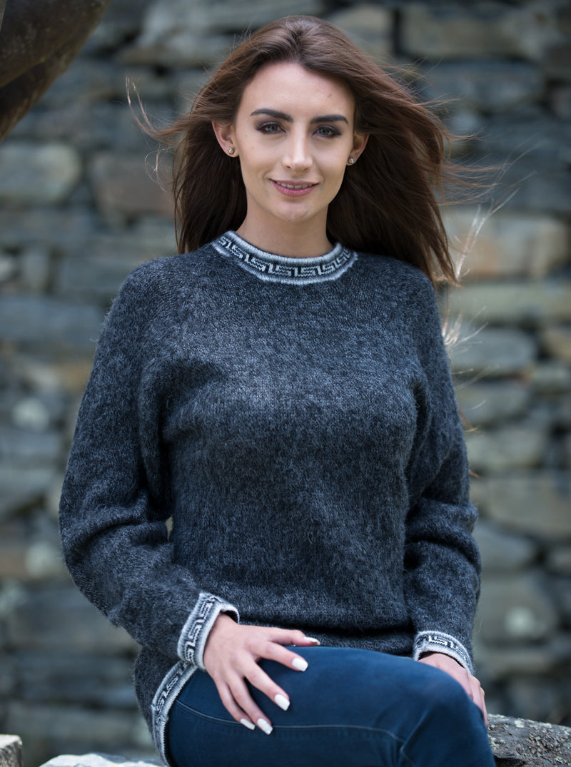 Pull à col rond à rayures horizontales et motifs géométriques colorés. Ce magnifique pull est chaud et confortable, parfait pour l'hiver. Cette pièce unique est faite à la main par des artisans boliviens experts. Matière: Mélange de laine.