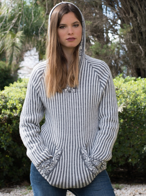Description : Pull fait à la main par des artisans boliviens, avec capuche et motif rayé. Il a un style rustique et décontracté. C'est un vêtement polyvalent, idéal pour les saisons froides d'hiver.