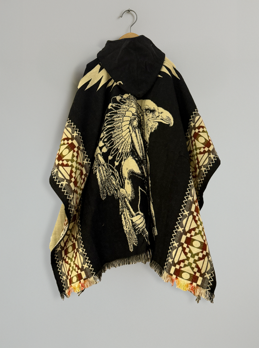 Mexican Geometric Wool Poncho | Black & Cream Tones