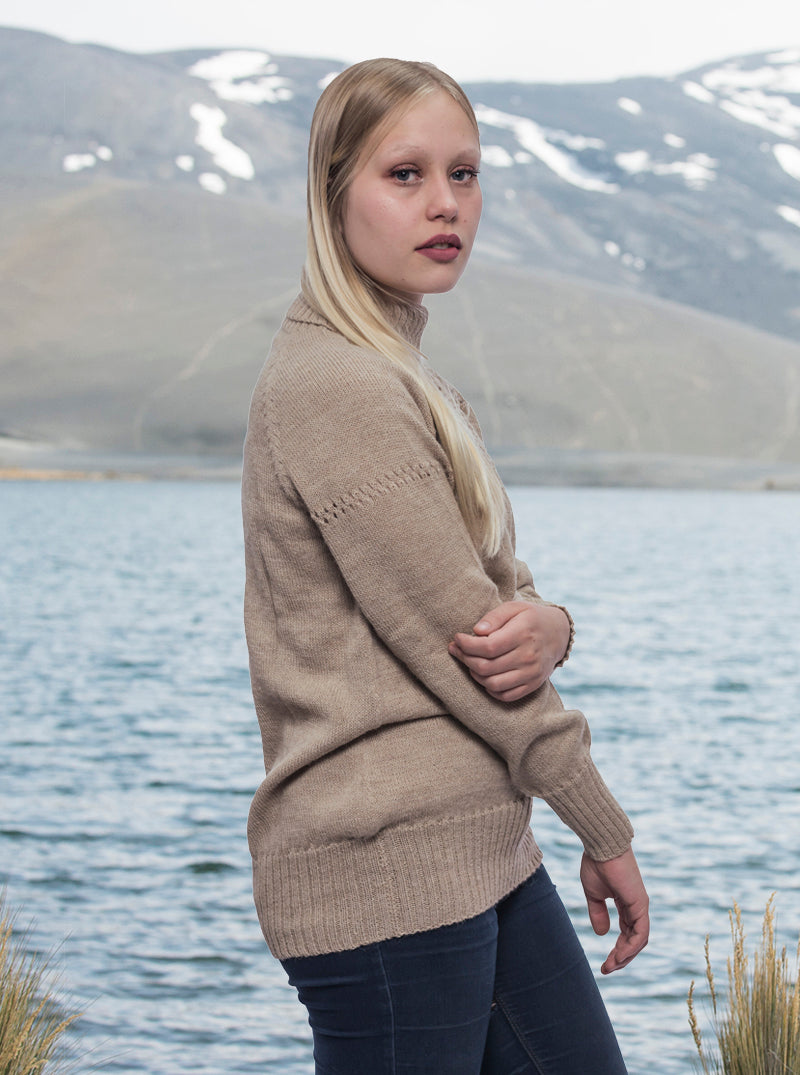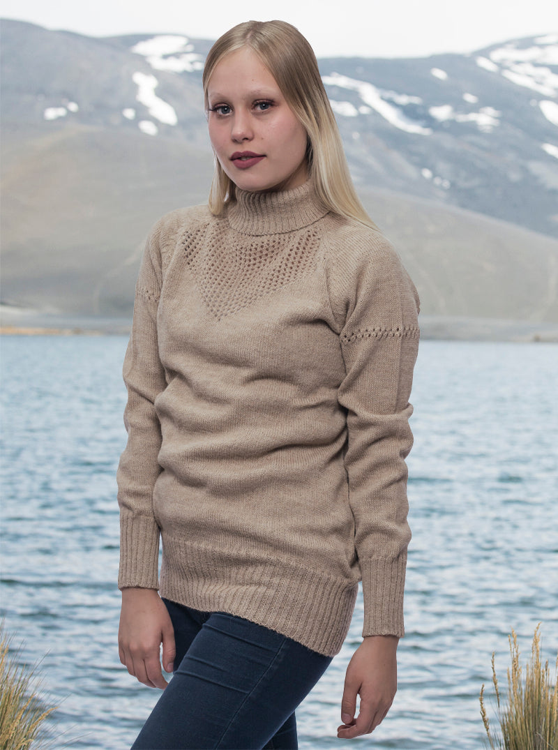 Descrizione: Caldo e confortevole, questo bellissimo maglione verde è realizzato in pregiata lana d'alpaca. Presenta un dolcevita femminile e casual.