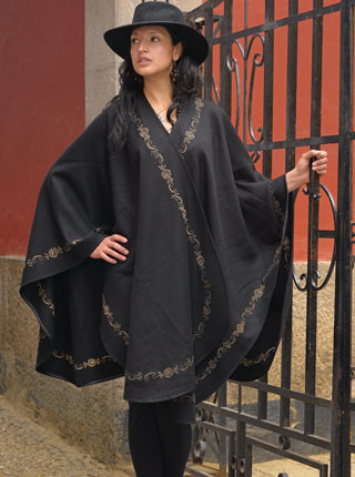 Bellissimo ed elegante mantello di lusso in 100% lana di alpaca pregiata. Questo mantello presenta bellissimi fiori ricamati sugli orli. Indossate questo capo delicato per una occasione speciale e aggiungete un tocco di classe ed elegante a qualunque vostro look. Morbido e caldo, è perfetto per l'inverno.