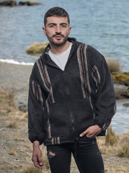Giacca in lana di alpaca con cappuccio e tasca centrale. Righe verticali bianche, grigie e marroni. Questo capo ha un design giovanile, casual e versatile, perfetto per svolgere qualsiasi attività all'aperto durante i freddi mesi invernali.