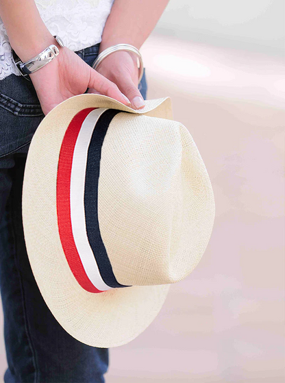 Add Parisian flair to your Panama hat with this elegant French flag hat band, showcasing the classic blue, white, and red tricolor. Whether you're celebrating Bastille Day, traveling, or simply love French style, this band delivers timeless sophistication.