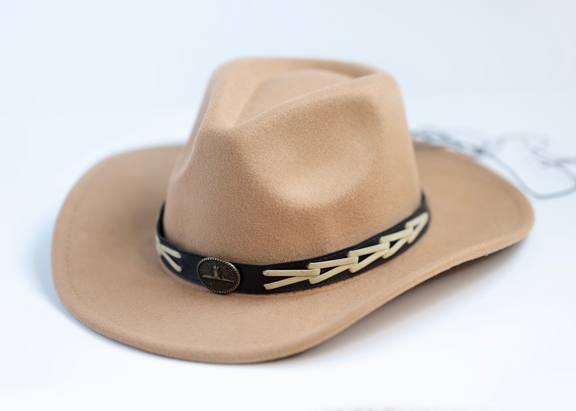 Channel authentic cowboy tradition with this Western hat band, featuring natural-toned cross-lacing, a bold longhorn concho, and a rugged faux leather base. Designed to capture the spirit of the American frontier, this band is perfect for those who ride with pride—on or off the trail.